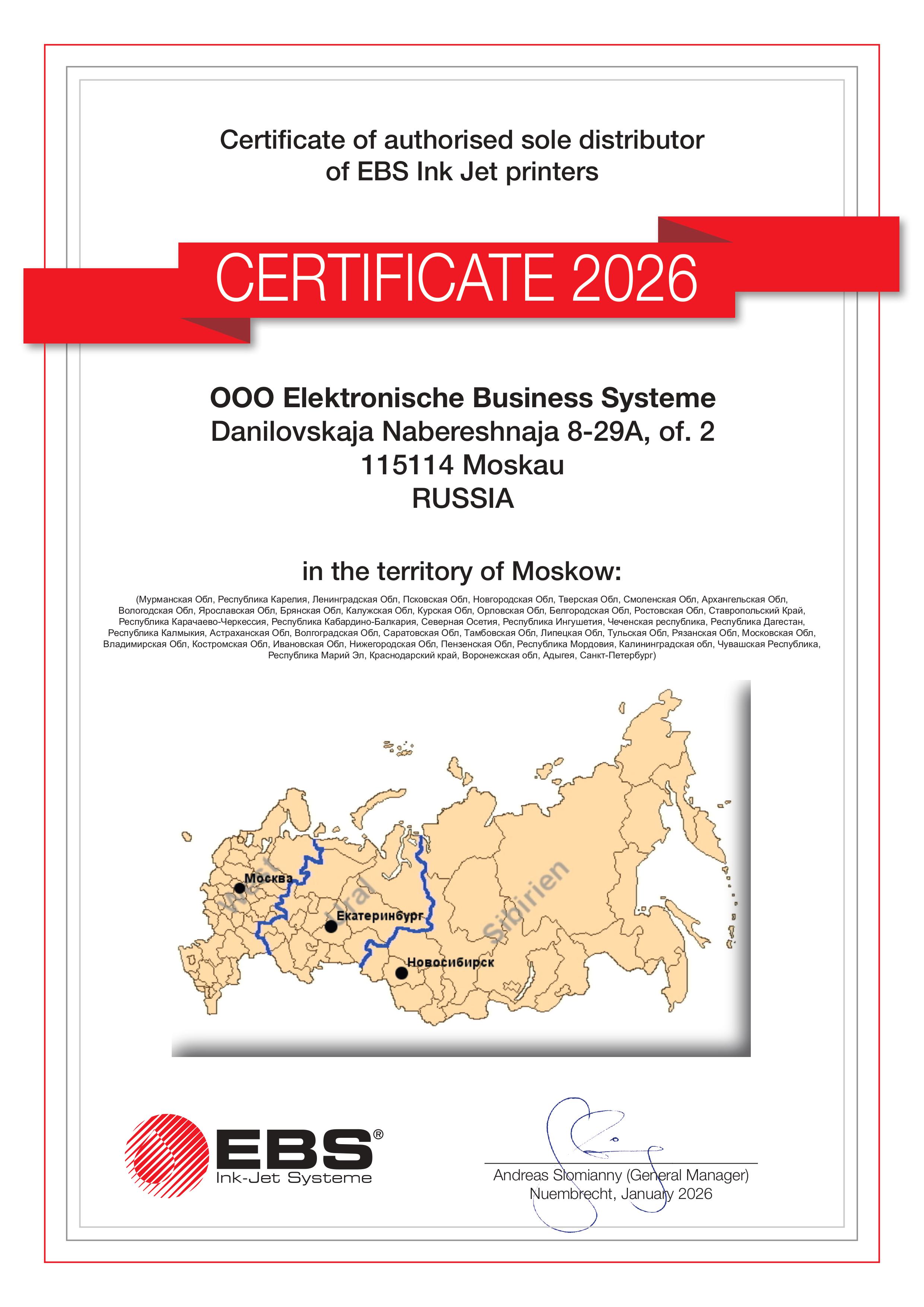Официальный дистрибьютор компании EBS на территории Центрального, Северо-Западного и Южного Федеральных округов - по продаже, гарантийному и сервисному обслуживанию оборудования для маркировки. (Мурманская обл, Республика Карелия, Ленинградская обл, Псковская обл, Новгородская обл, Тверская обл, Смоленская обл, Архангельская обл, Вологодская обл, Ярославская обл, Брянская обл, Калужская обл, Курская обл, Орловская обл, Белгородская обл, Ростовская обл, Ставропольский Край, Республика Карачаево-Черкессия, Республика Кабардино-Балкария, Северная Осетия, Республика Ингушетия, Чеченская Республика, Республика Дагестан, Республика Калмыкия, Астраханская обл, Волгоградская обл, Саратовская обл, Тамбовская обл, Липецкая обл, Тульская обл, Рязанская обл, Московская обл, Владимирская обл, Костромская обл, Ивановская обл, Нижегородская обл, Пензенская обл, Республика Мордовия, Калининградская обл, Чувашская Республика, Республика Марий Эл, Краснодарский край, Воронежская обл, Адыгея, Санкт-Петербург)